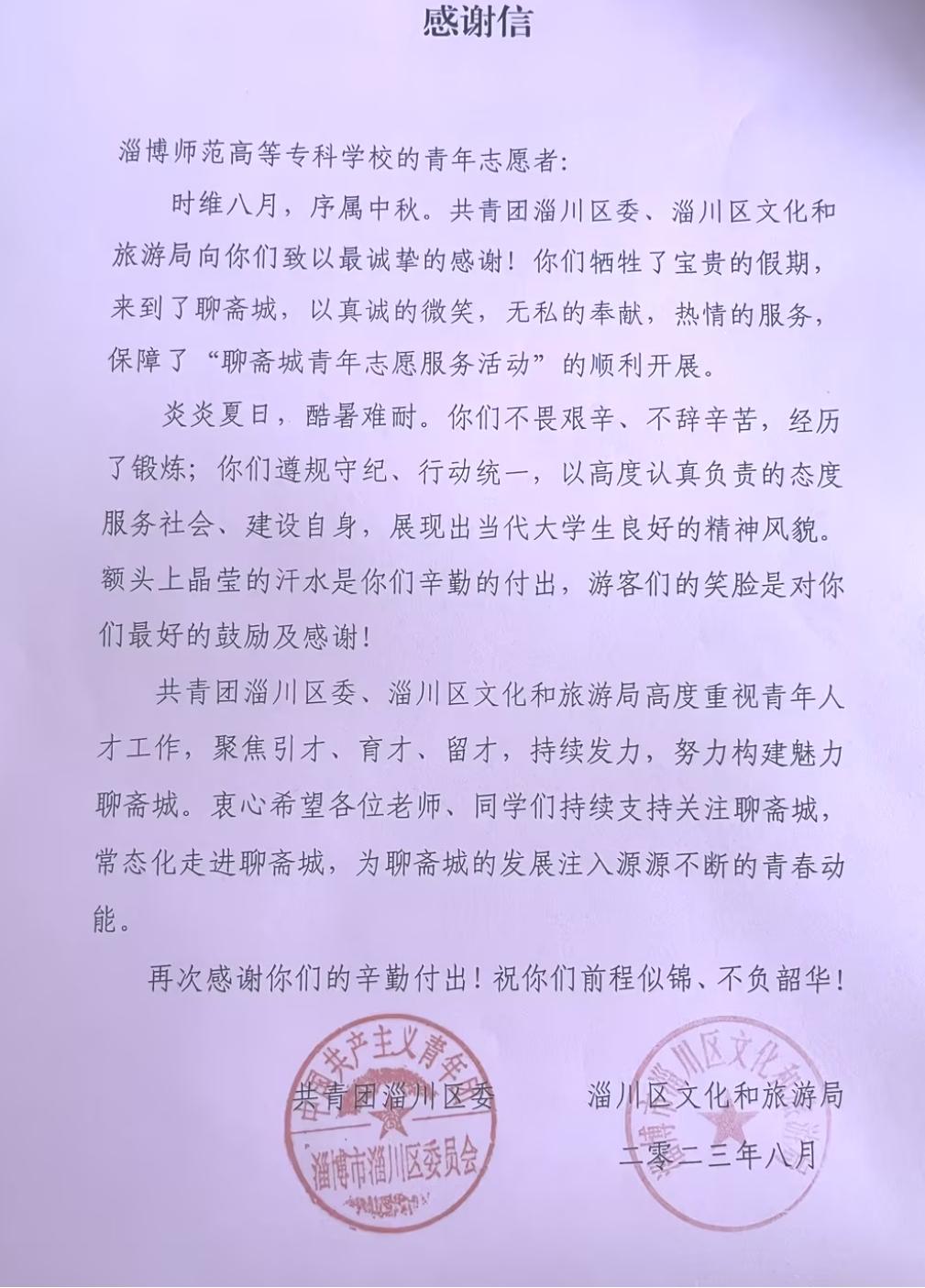 首创“校校共研学”模式,打造出“淄小旅”志愿服务队和“文旅淄博”两支志愿服务队,积极参加学校及淄博市各类志愿服务活动,获得“青年志愿服务工作先进集体”称号。通过打造产教融合新模式,先后获省康养专业100万元办学奖补,开展“一院百村,助力乡村振兴”活动,与西河镇、齐艾产业园进行横向项目研究,获项目资金35万元。