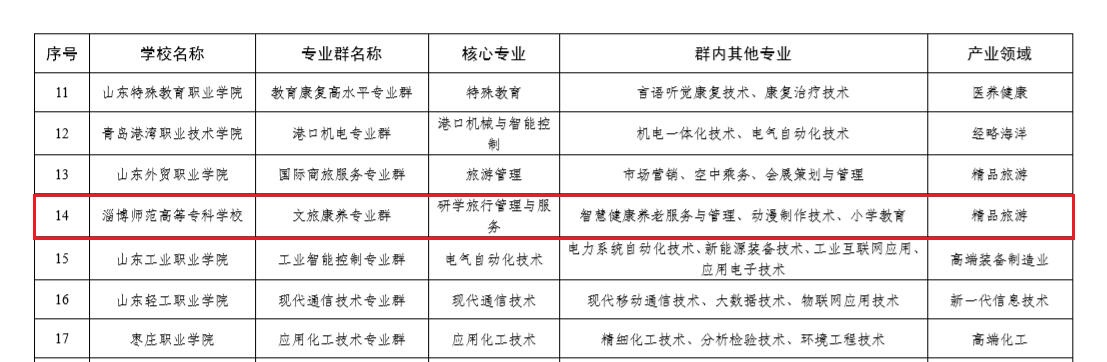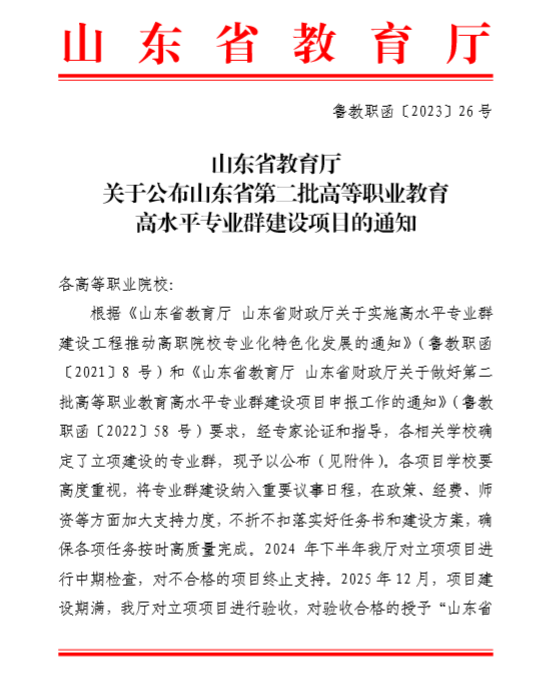 近日山东省教育厅发文《关于公布山东省第二批高等职业教育高水平专业群建设项目的通知》(鲁教职函〔2023〕26 号),我校文旅康养专业群获批为山东省第二批高等职业教育高水平专业群建设项目。