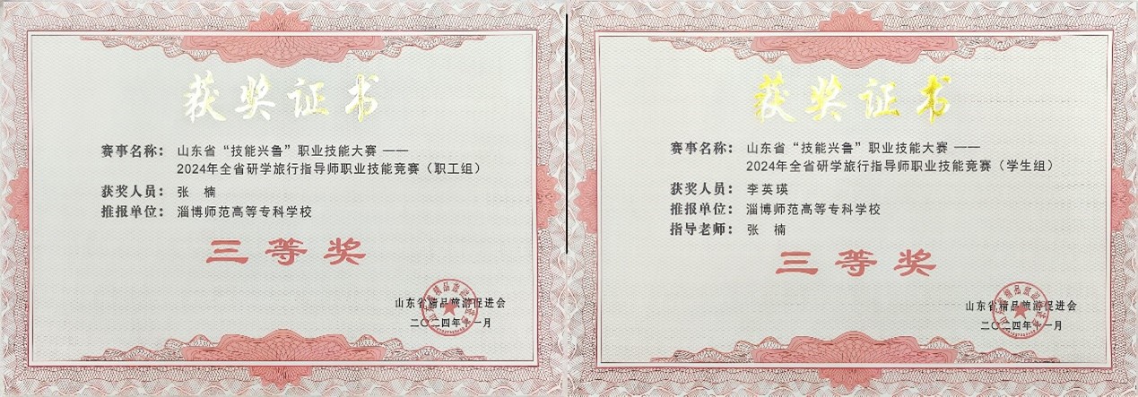 此外,在2024年山东省“技能兴鲁”职业技能大赛——全省研学旅行导师职业技能竞赛中,点点体育师生同样收获颇丰。学生李英瑛在张楠老师的指导下荣获学生组三等奖;教师张楠在职工组竞赛中也荣获三等奖。