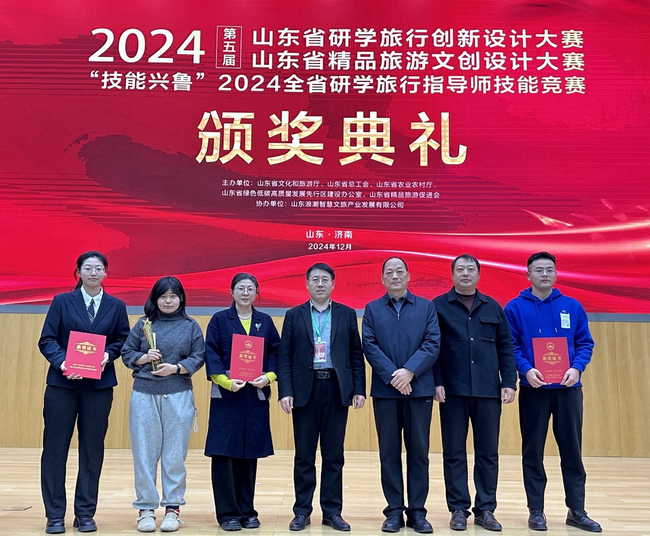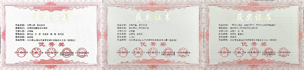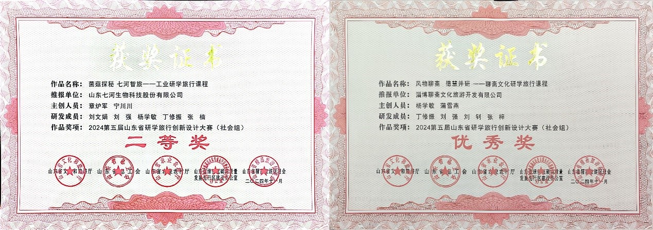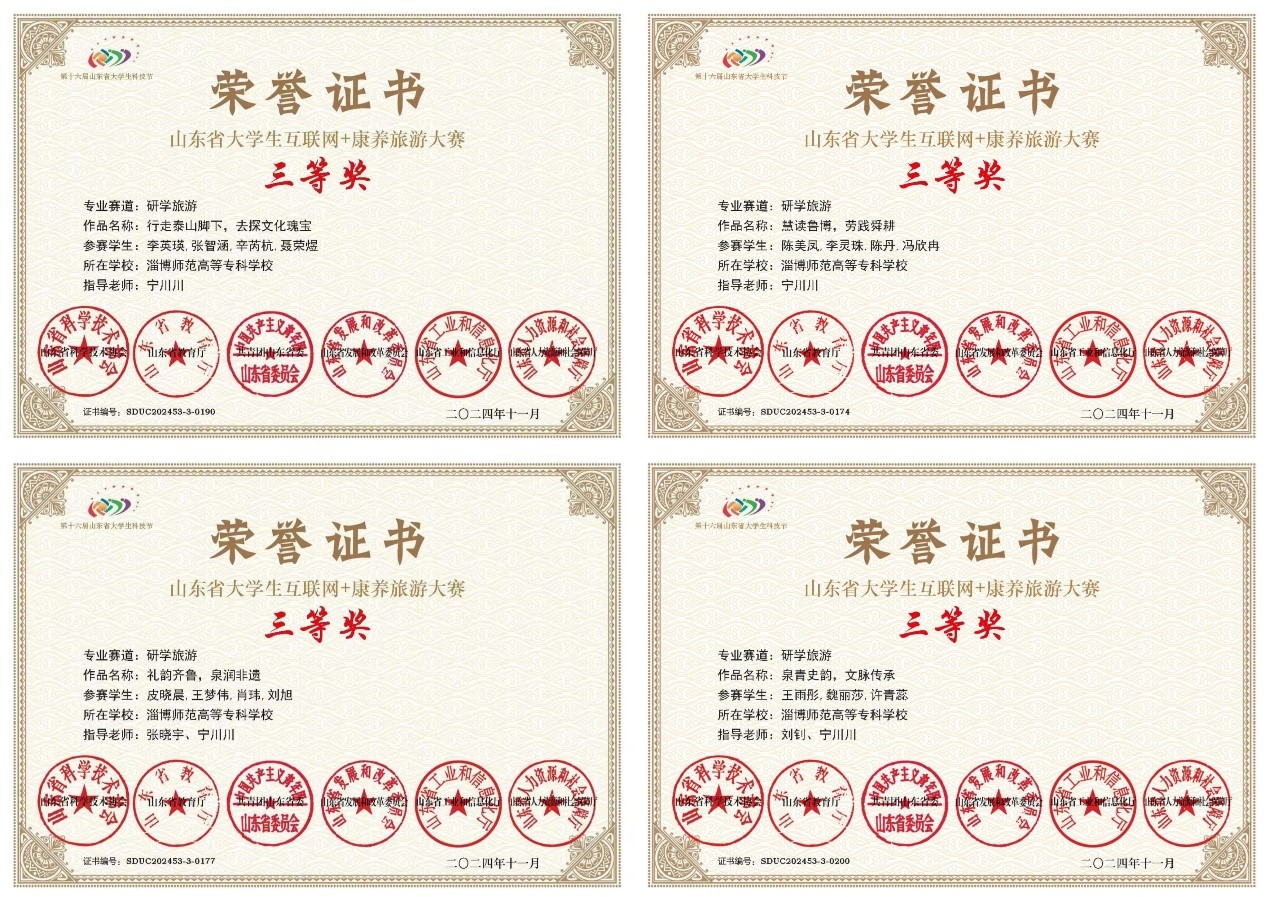 值得一提的是,在2024第五届山东省研学旅行创新设计大赛中,学院师生大放异彩。“黄河入海流,雁霞齐双飞”黄河生态研学课程设计项目,由孟垂开、吴岳主创,李安华、崔寒冰研发,李东轩老师指导,荣获院校组优秀奖;“礼韵齐鲁,泉润非遗”项目,由皮晓晨主创,王梦伟、张淑贤研发,宁川川老师指导,荣获优秀奖;“五常之辉 圣范永存”项目,由王琦嘉主创,贾浩然、孔源、马宏宇、滕悦、朱袆雪研发,杨学敏指导,荣获优秀奖;“菌菇探秘 七河智旅——工业研学旅行课程”项目,由章炉军、宁川川主创,刘文娟、刘强、杨学敏、丁修振、张楠研发,荣获社会组二等奖;“风物聊斋,德慧并研——聊斋文化研学旅行课程”项目,由杨学敏、蒲雪燕主创,丁修振、刘强、刘钊、张梓研发,荣获社会组优秀奖。