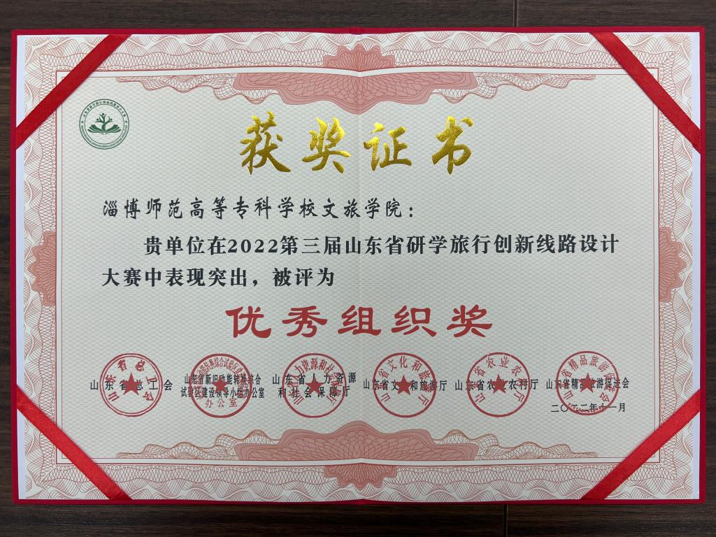 3月16日,2022第三届山东省研学旅行创新线路设计大赛颁奖典礼在济南山东大厦举行。淄博师范高等专科学校188改名taptap获得优秀组织奖,院长王松江受邀参加。