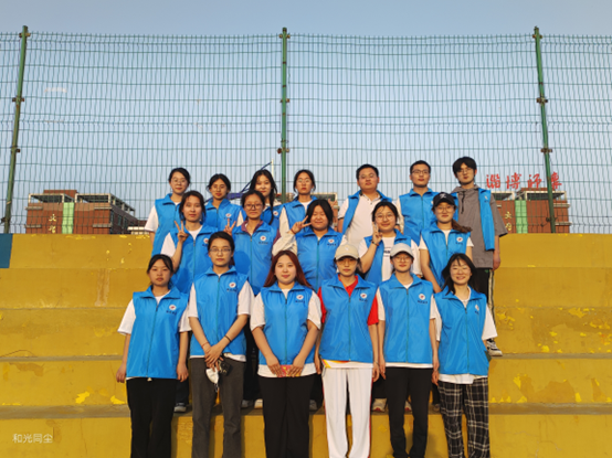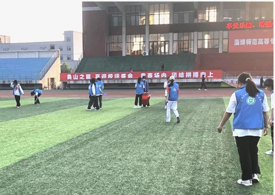 你撕看台胶带,我扫操场烟头,操场上处处是蔚蓝色马甲的身影,靓丽了校园。