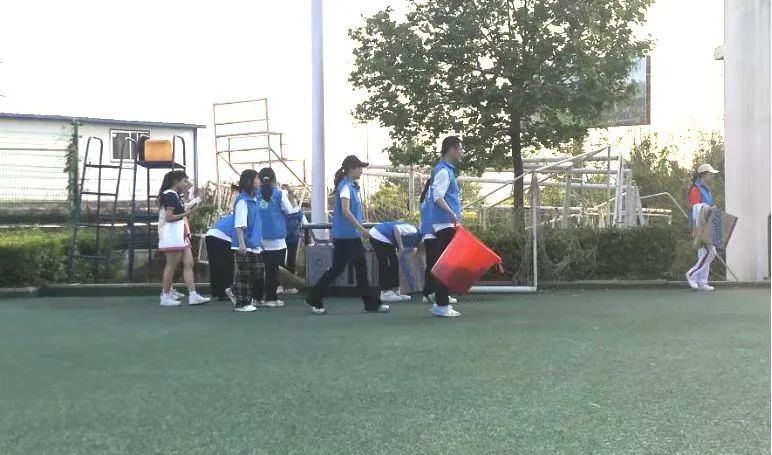 打扫过程中,学生之间分工协作、互帮互助。先是对草地上的纸屑、彩带皮进行捡拾,接着处理看台上胶带残留,最后对卫生工具清点并收拾学生的遗忘物件。经过两小时的清扫,学校操场变得焕然一新。