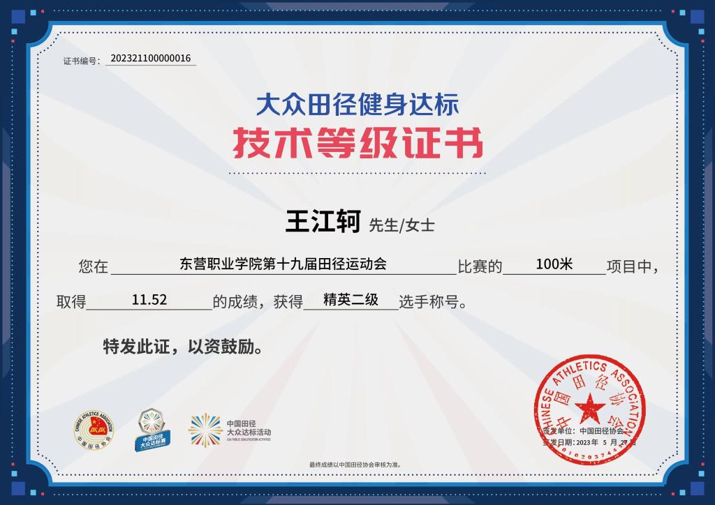 在比赛过程中,我校参赛运动员捷报频传。其中,我院2022级研学旅行管理与服务专业学生王江轲在100米项目中取得了11″52的佳绩,并获得由中国田径协会颁发的“精英二级”的荣誉证书。