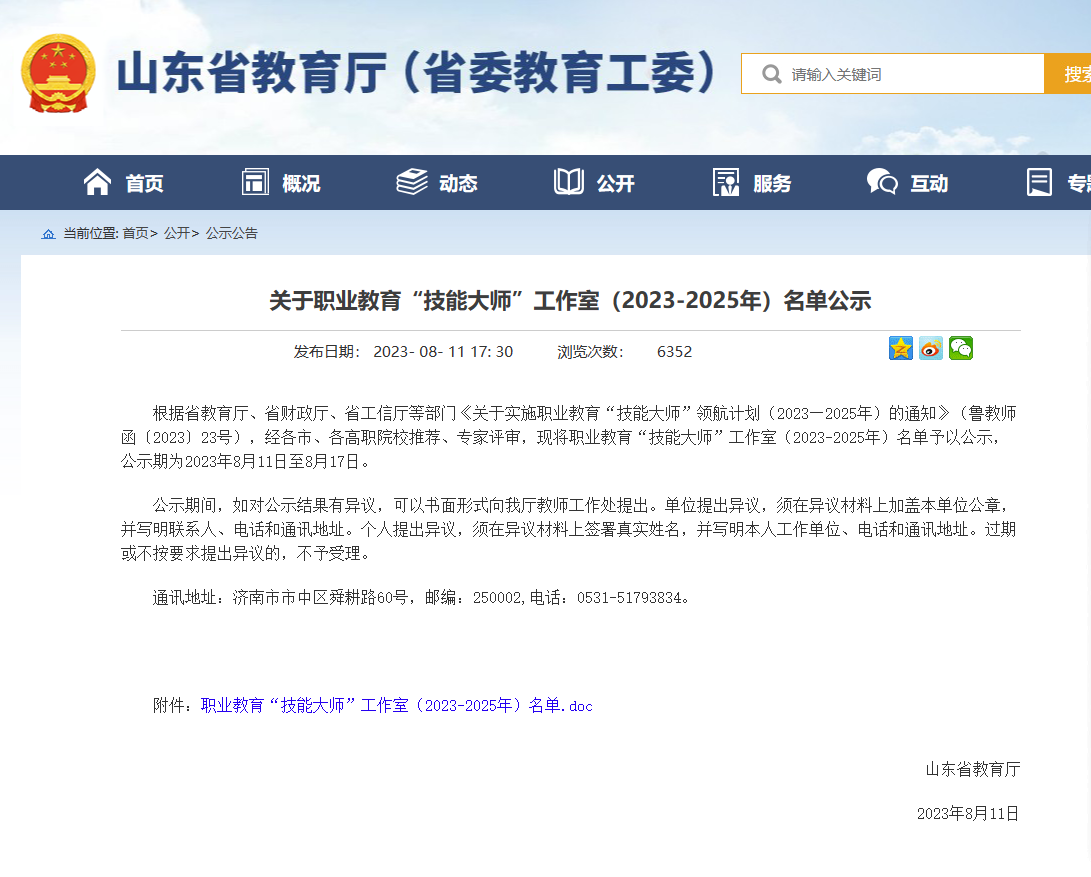 近日,由山东省教育厅、省财政厅、省工信厅等部门联合发文宣布《关于实施职业教育“技能大师”领航计划(2023—2025年)的通知》(鲁教师函〔2023〕23号),全省115个院校获选,其中点点体育联合岜山集团共同申报的周毅德技能大师工作室成功入选。