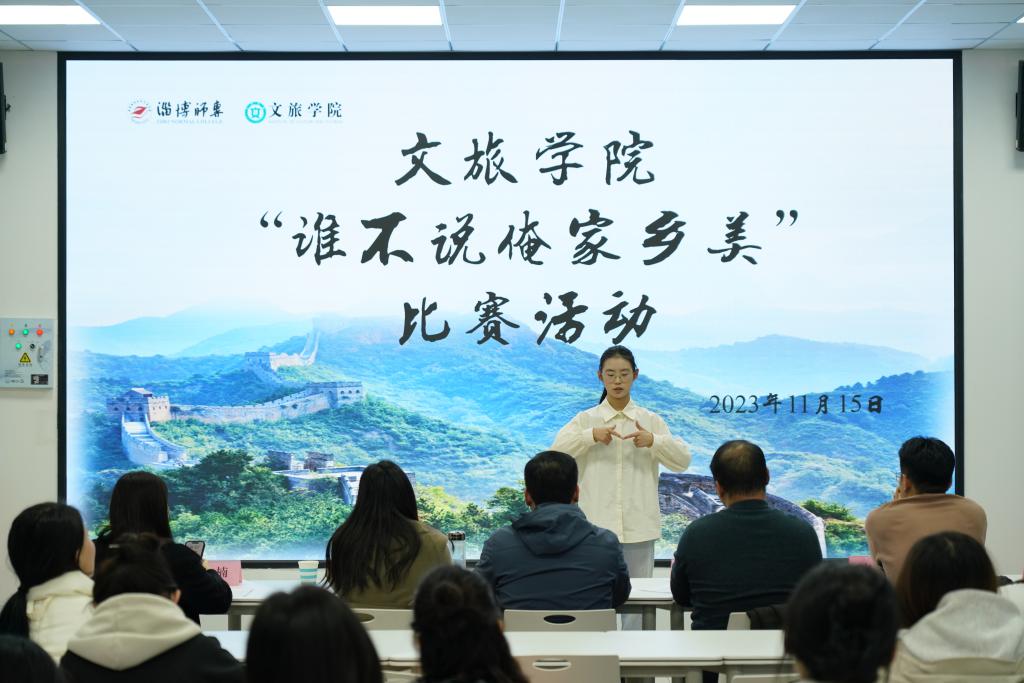 本次比赛内容共包含三部分:讲解、才艺和答辩环节。经过班级初赛选拔,最终14名参赛选手登上院赛舞台,依次推介家乡精品资源、展示文艺节目,评委老师围绕学生的解说内容和专业知识进行提问。比赛过程节奏紧密,选手推介了淄博、济南、济宁、日照等不同地域文旅特色,展示了朗诵、唱歌、口琴、手语等多样化表演,让评委老师们耳目一新。