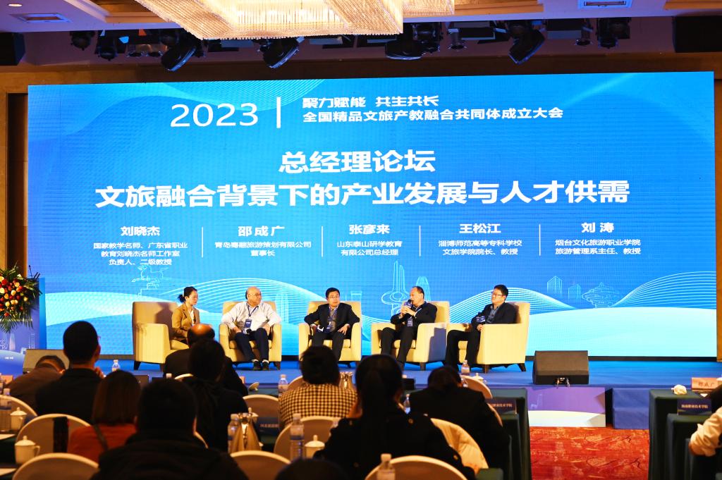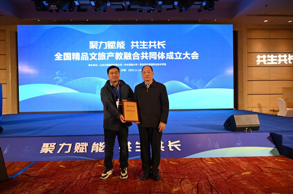 全国研学旅行产教融合共同体由山东文旅集团、中央民族大学、青岛酒店管理职业技术学院牵头共同组建,并在教育部管理下,联合169家行业组织、学校、科研机构、上下游企业等共同参与,以期培养更多高素质高技能的文旅人才,全面强化对全行业发展的支撑。大会宣读了共同体章程(草案),公布了共同体组织架构和第一届理事会理事长单位、常务副理事长单位、副理事长单位、常务理事单位并授牌,我校被选定为副理事长单位。