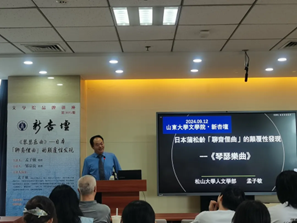 近日,山东大学文学院新杏坛举办《<琴瑟乐曲>——日本聊斋俚曲的颠覆性发现》专题讲座。讲座由日本松山大学孟子敏教授主讲,山东大学文学院教授、蒲松龄研究会名誉会长邹宗良先生主持。