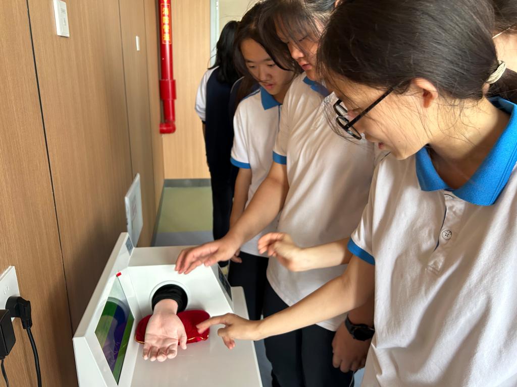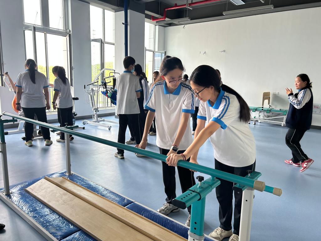 会后,来访师生前往北校区实验实训中心参观学习。黄加成、张家才两位老师详细介绍了实训中心的建设情况。学生们在老师指导下动手体验了电动颈椎牵引椅、脉象模拟器和康复平行杠等实验实训设备,亲身感受了智慧健康养老技术的实际应用场景。