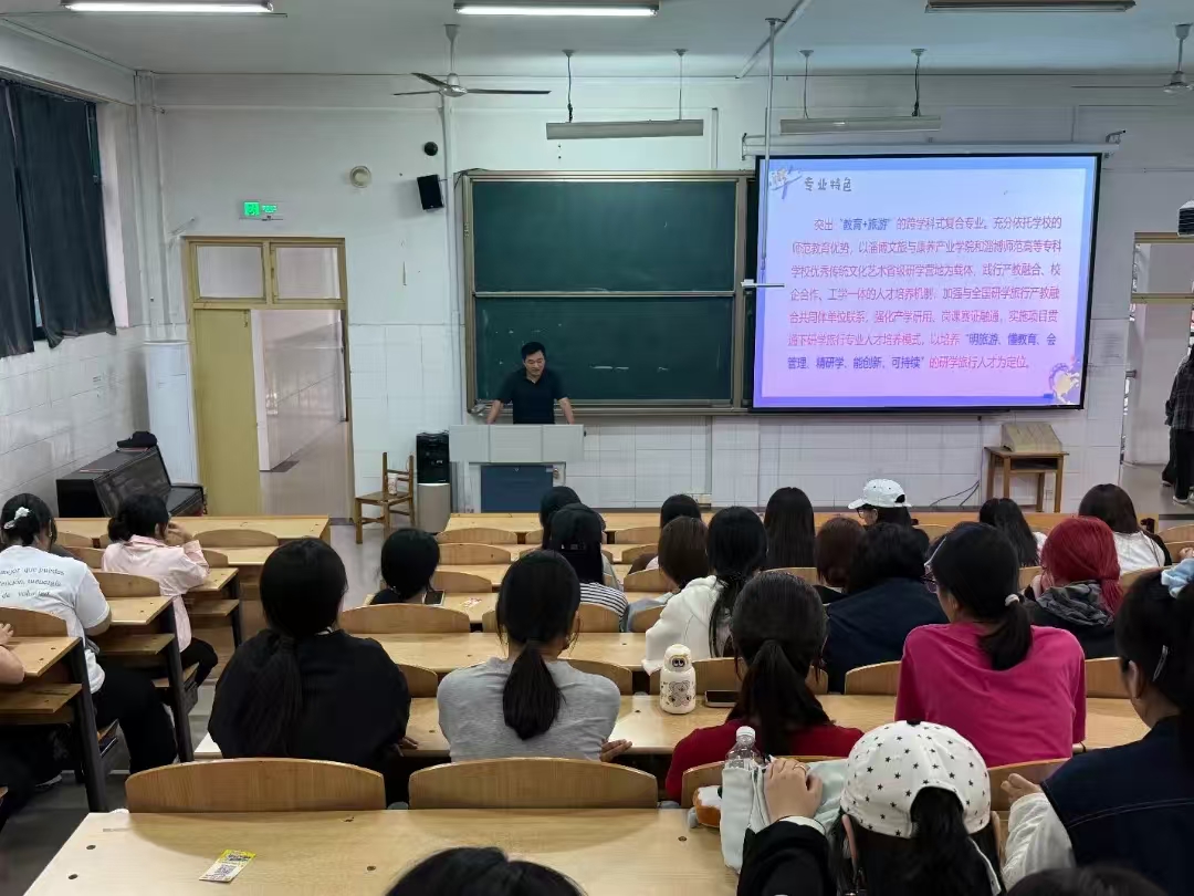 在专业内涵解读中,刘强老师结合研学旅行管理与服务专业建设情况,从人才培养目标等方面,让新生们对专业情况有了清晰的认识。他鼓励大家要读万卷书,行万里路,多多参与不断丰富自己,提升专业技能,以更好地适应岗位工作要求。